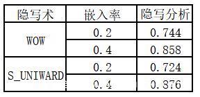 分别将使用方案六的隐写分析模型检测自适应隐写书WOW的0.2嵌入率、S_UNIWARD的0.2嵌入率和0.4嵌入率下的隐写检测准确率,结果如下表所示。