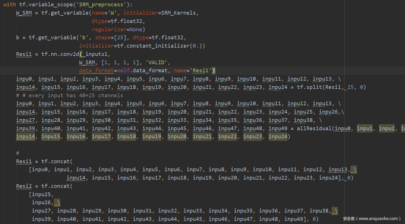 本文的模型是在tensorflow的框架上设计并实现的。在第一阶段,首先通过高通滤波器计算得出一个25通道的残差特征图,然后对他们进行量化截断操作得到两个25通道的约束型残差特征图。关键代码如下图所示。