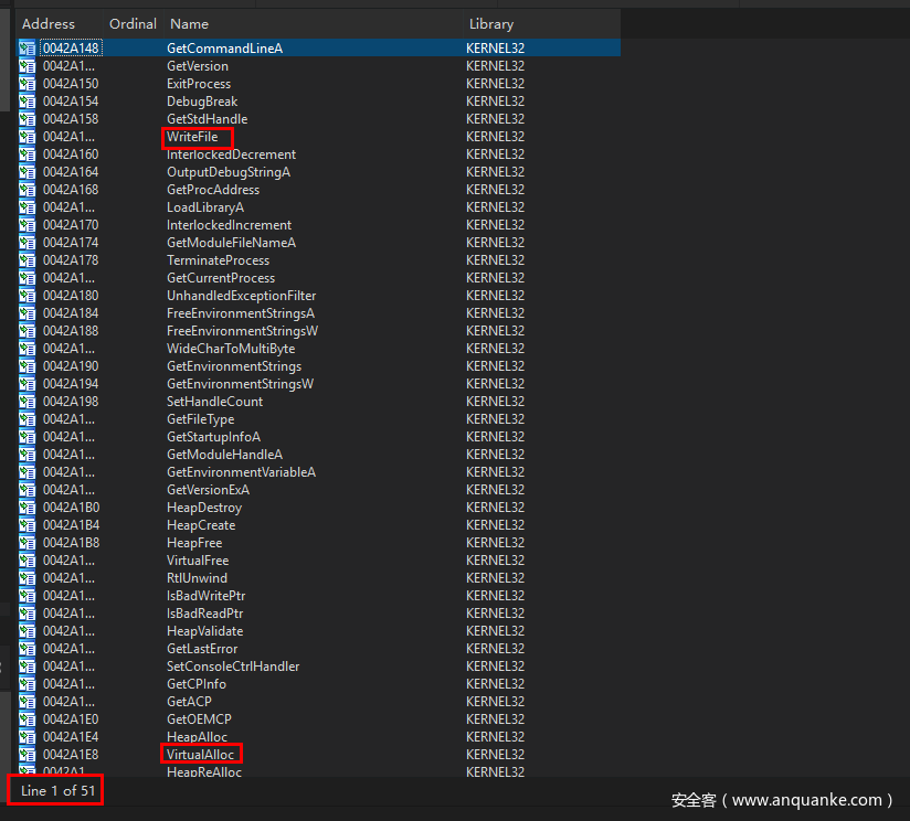 通过导入表,可以看到在本程序中一共使用了39个导入函数。我们可以对这些导入函数进行初步分析。