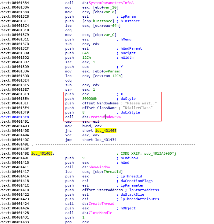 接着,程序执行一系列操作对参数进行处理,然后调用CreateWindowExA函数创建窗口