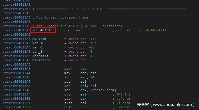 然后对StartAddress进行交叉引用,然后找到函数头部,发现是sub_4013A3