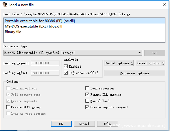 首先将样本拖动到IDA中,IDA自动识别这是一个PE文件