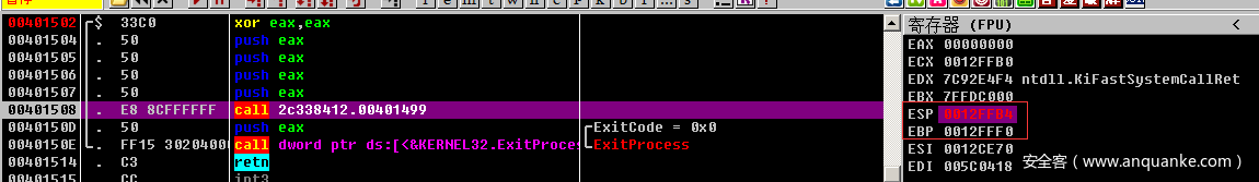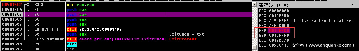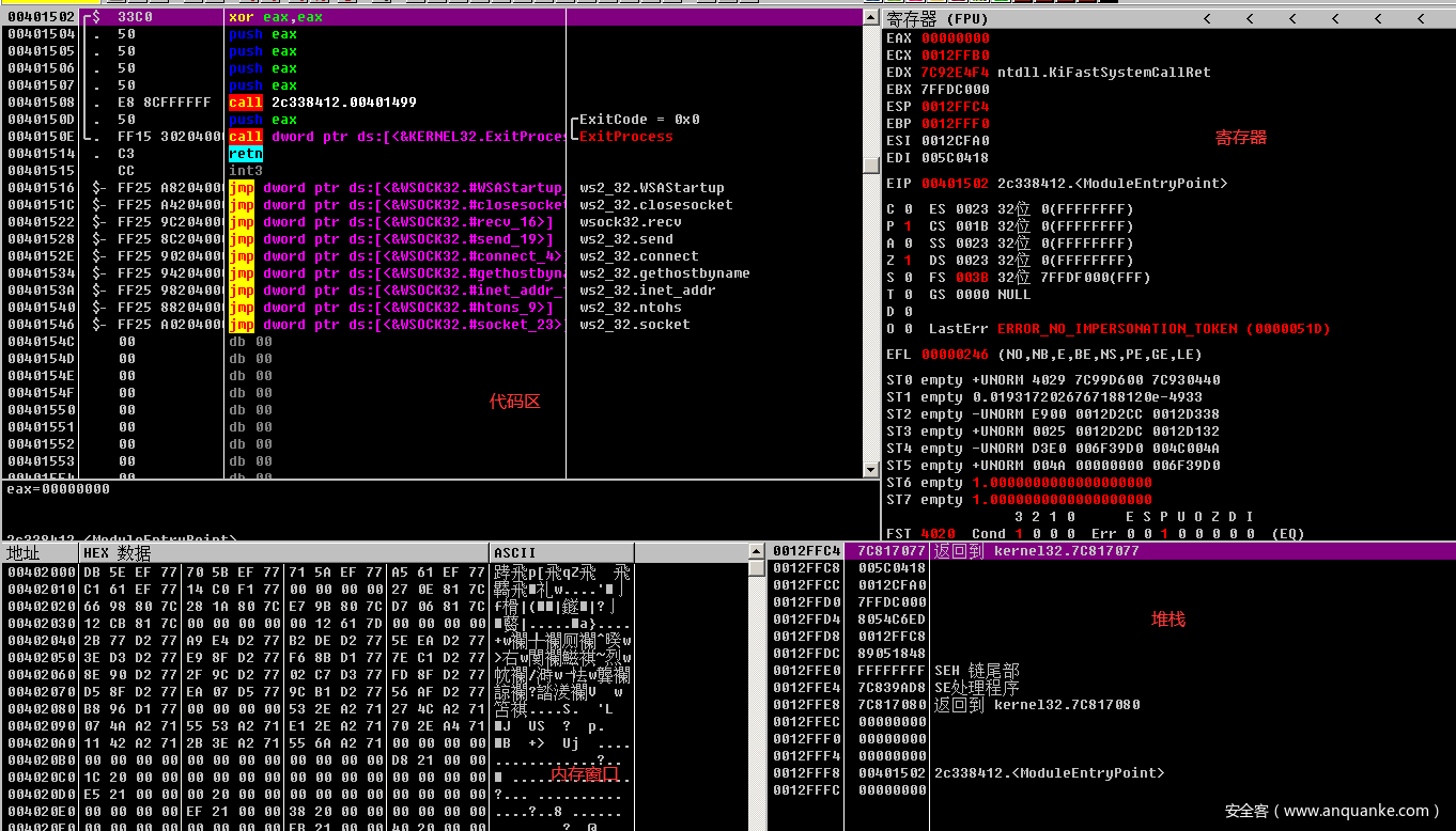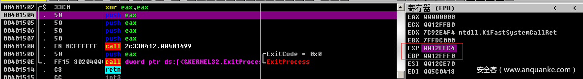 首先通过xor eax eax的方式将寄存器eax的值清零。
