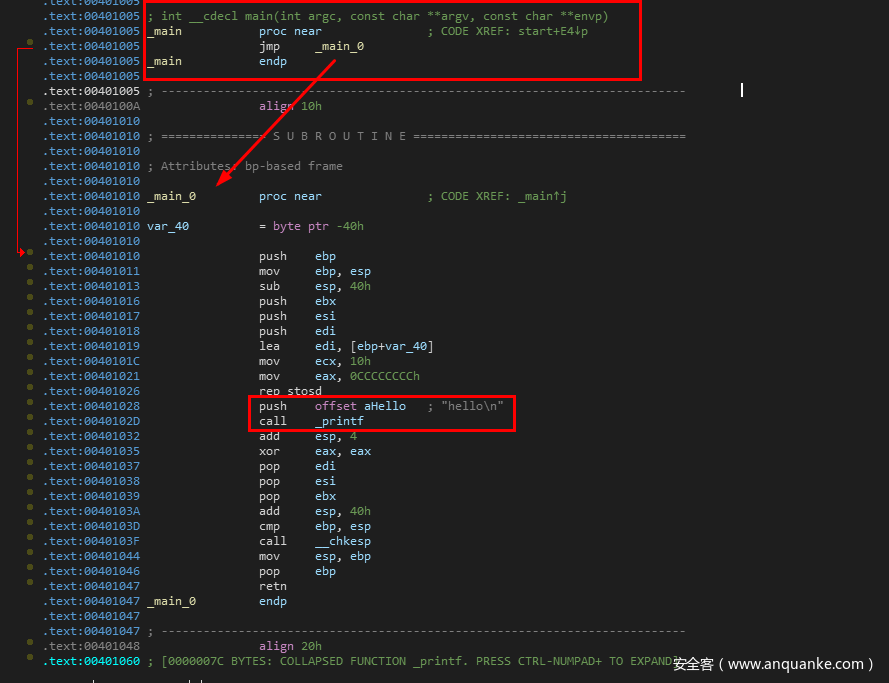 其余部分与vc里面写的几乎一模一样,没有#inclde<stdio.h>的原因之前已经讲过了,这部分属于预处理指令,已经在编译之前就处理掉了,所以反汇编之后,不会再显示。