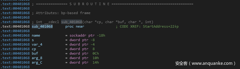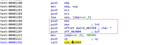 在该函数中,程序首先push 了几个参数,然后调用call sub_401068函数