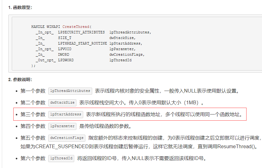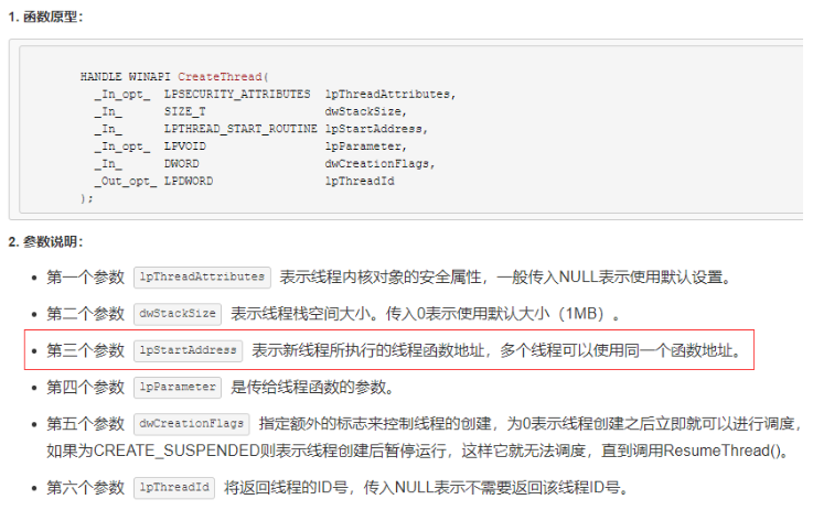 通过查阅CreateThread函数,我们可以知道该函数的关键调用点在参数3,即新线程的起始地址