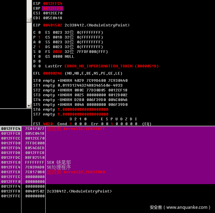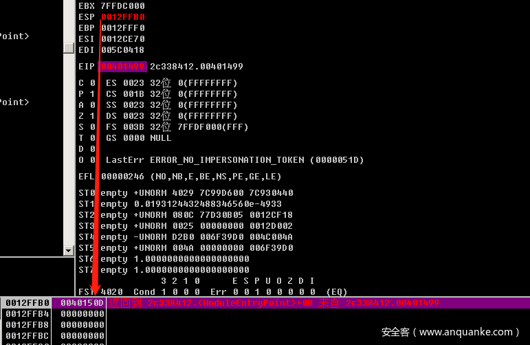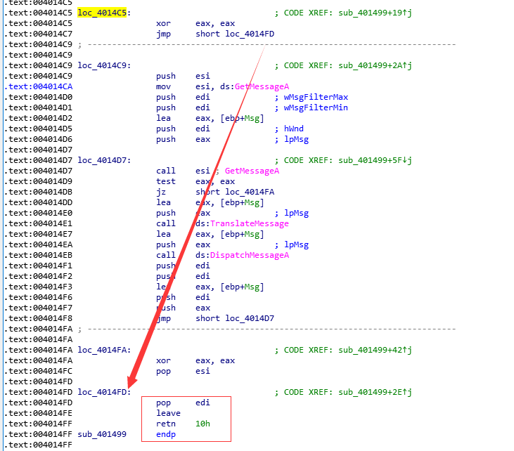 从代码这里也可以看到,如果eax等于0,跳转到loc_4014C5之后会jmp跳转到loc_4014FD,然后执行retn 指令,程序结束。