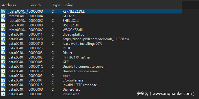 字符串表中会显示出IDA对该样本提取的所有字符串。在程序未加壳或是混淆的情况下,我们可以通过Strngs Window 查看程序中所用到的字符串,在该样本中如下: