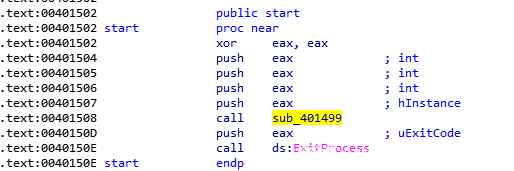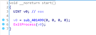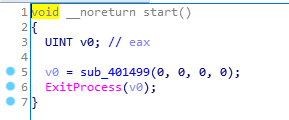 在start函数中,程序调用了sub_401499这个函数,当sub_401499执行完成之后,调用ExitProcess函数结束进程。