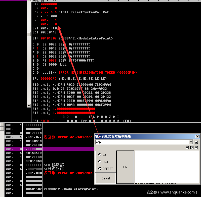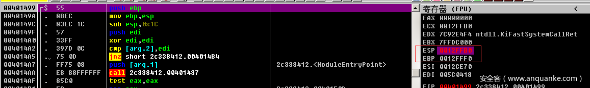 接着程序会执行mov ebp,esp的指令。