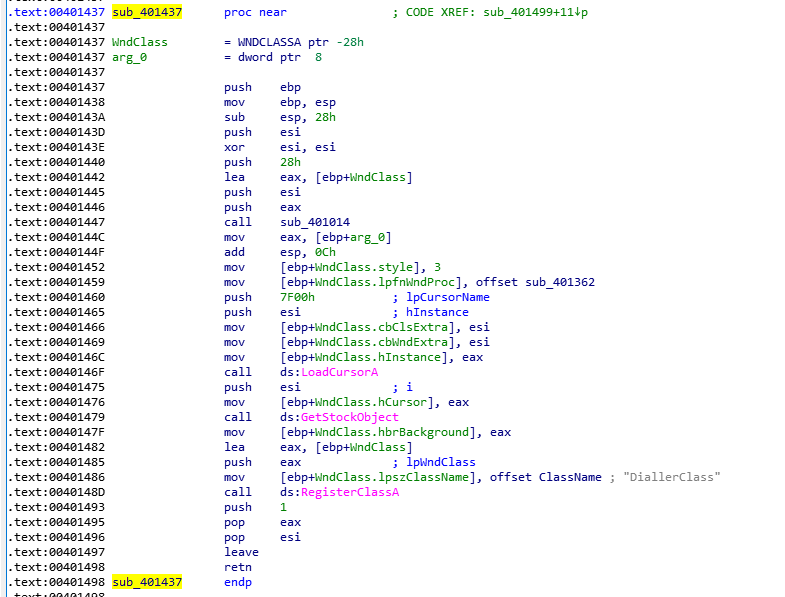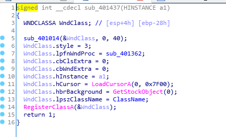 在sub_401437函数中,首先定义了一个名为WndClass的结构体,类型为WNDCLASSA,并且在后面,通过WndClass.xxxx=xx的方式给这个结构体的成员变量进行赋值。