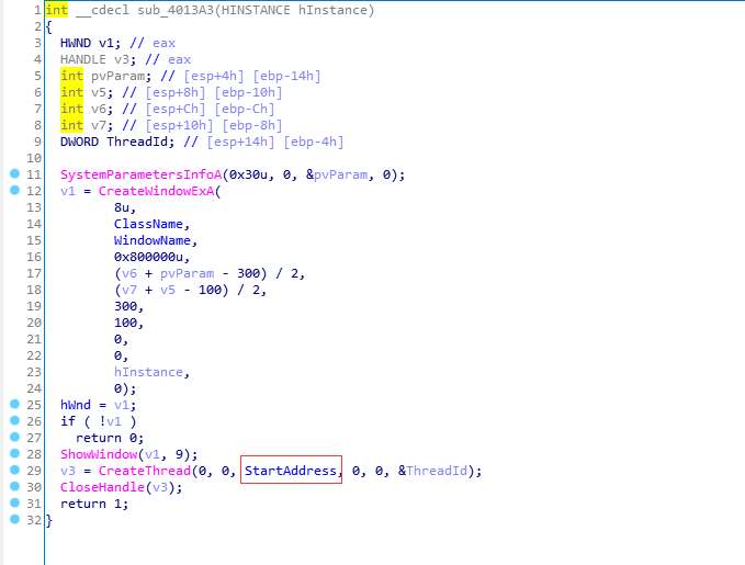 在当前函数中,参数3是StartAddress 我们双击过去看看