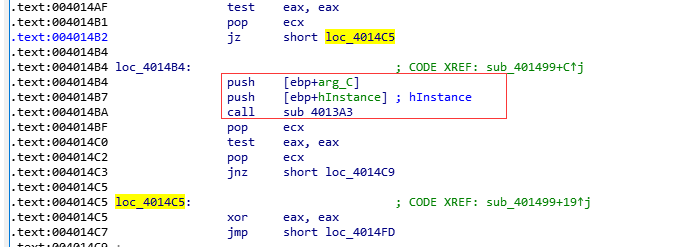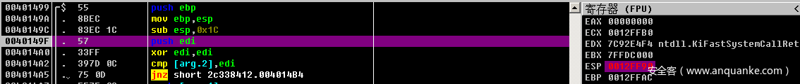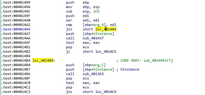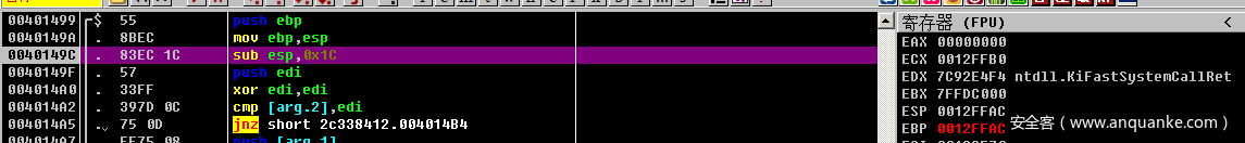 比较之后,如果edi 和 [ebp+arg_4]不相等,则执行后面的jnz操作,跳转到loc_4014B4的地方。