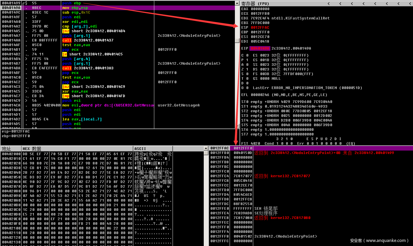 现在我们知道函数调用是,栈区的变化了,我们回到IDA中看代码。