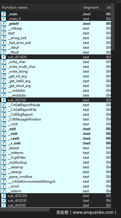 此外,VC编译的时候,会生成大量的库函数,所以反汇编出来,也会生成大量的库代码,在本程序中,我们只在main函数中进行了输出,但是程序却生成了这么多函数: