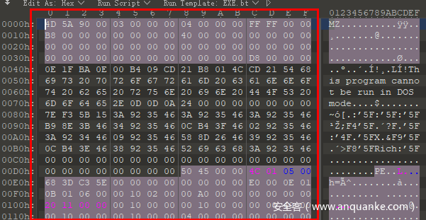 我们将exe文件放入十六进制编辑器(如winhex、010Editor等)中可以看到如下的数据