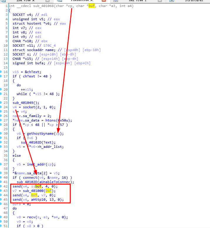我们还是进入到sub_401068函数看一看,与我们推算的一致,程序首先会建立一个socket,然后通过gethostbyname获取cp的地址,然后后面通过connect连接,最后通过send发送数据到服务器,通过recv接受返回值。