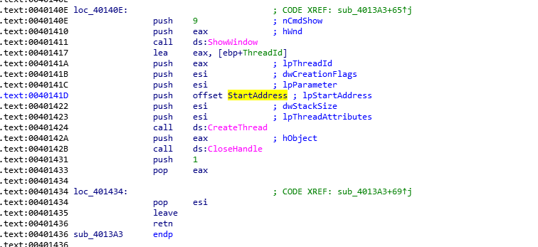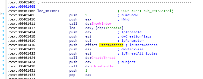 这就说明,当CreateThread调用之后,程序会跳转到该函数第三个参数的位置执行。这里是StartAddress