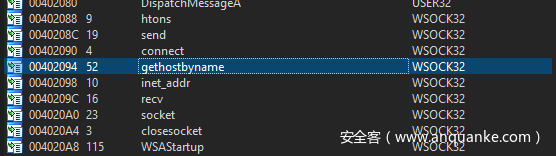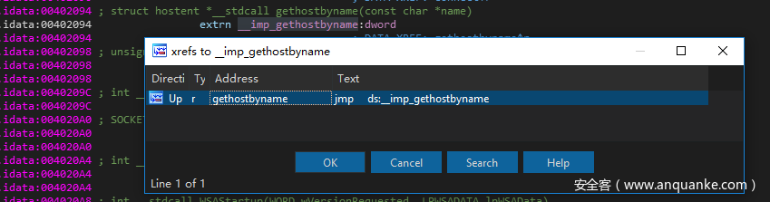 比如我们想要查看gethostbyname的调用位置,我们可以双击该API的名称: