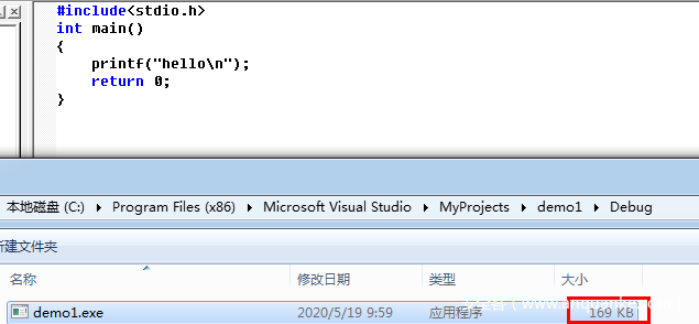 可以看到,Debug版本生成之后,仅仅6行代码,却生成了169k的exe文件。
