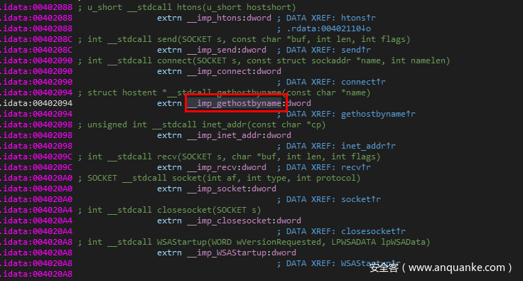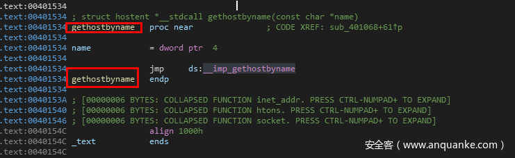 可以看到,这里是在一个名为gethostbyname的函数中调用了,我们继续对gethostbyname按X查看交叉引用,过来之后,gethostbyname函数前后的代码如下。
