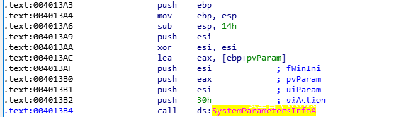 该函数初始化栈完成之后首先会push一些参数,并调用SystemParametersInfoA