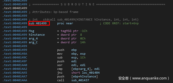 接着push了四个eax(0)入栈,然后通过call指令调用sub_401499函数。