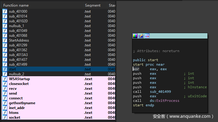 对sub_401499函数进行交叉引用,回到了start函数这里,就是我们最开始看到的IDA默认停留的入口点。所以我们现在通过交叉引用搞清楚了gethostbyname这个API的调用链,也基本确定了这个函数是由用户代码编写调用的,以及函数的调用位置。