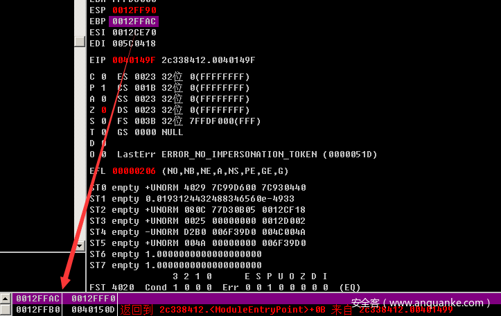 且现在ebp的地址存放的是上一个函数ebp的地址,ebp后面的地址存放的是返回地址。