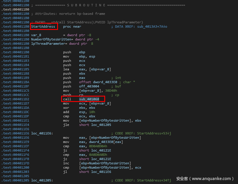 在StartAddress中,首先会调用sub_401068函数,该函数有4个参数,分别是