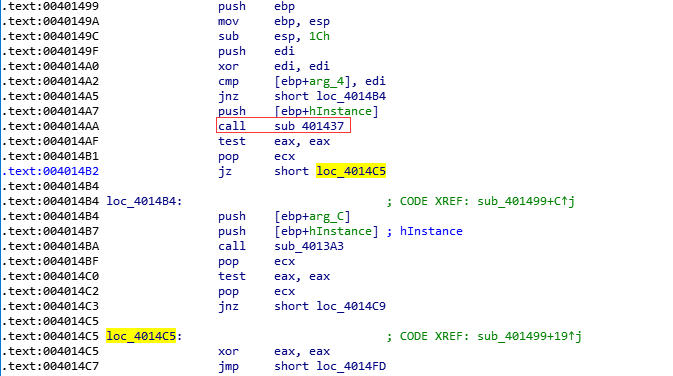 在sub_401437函数调用完成之后,程序会通过test eax ,eax的操作判断eax的值是否为零。
