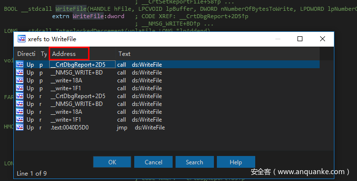 同样的方法,我们对WriteFile进行交叉引用,可以看到调用处有点多,这里需要注意一下Address标题下的内容,这里全是以__开头,基本可以确定是系统的代码调用,我们随便找一个地址过去。