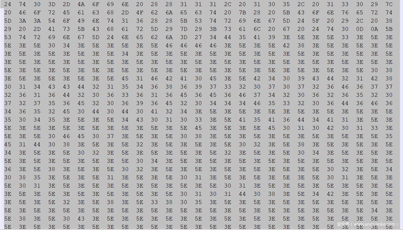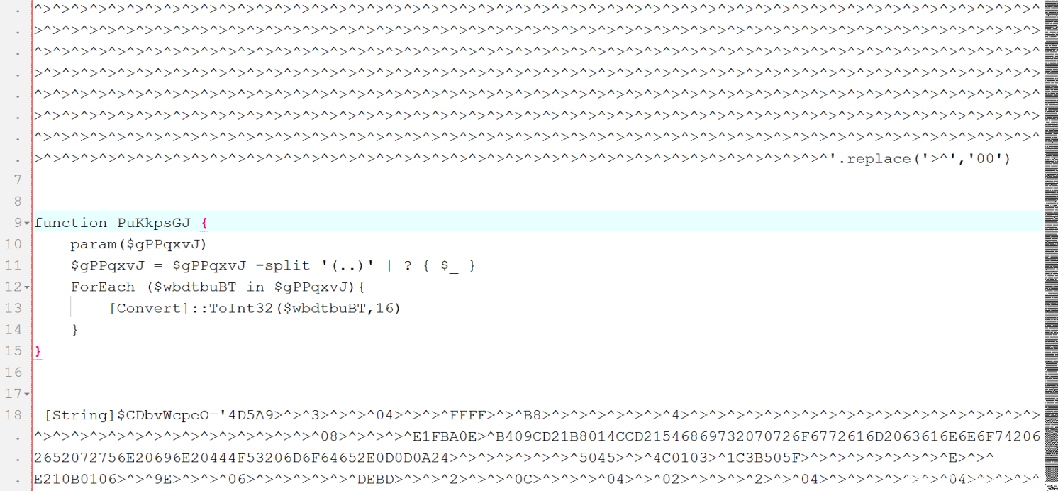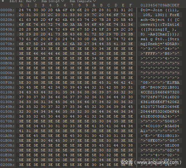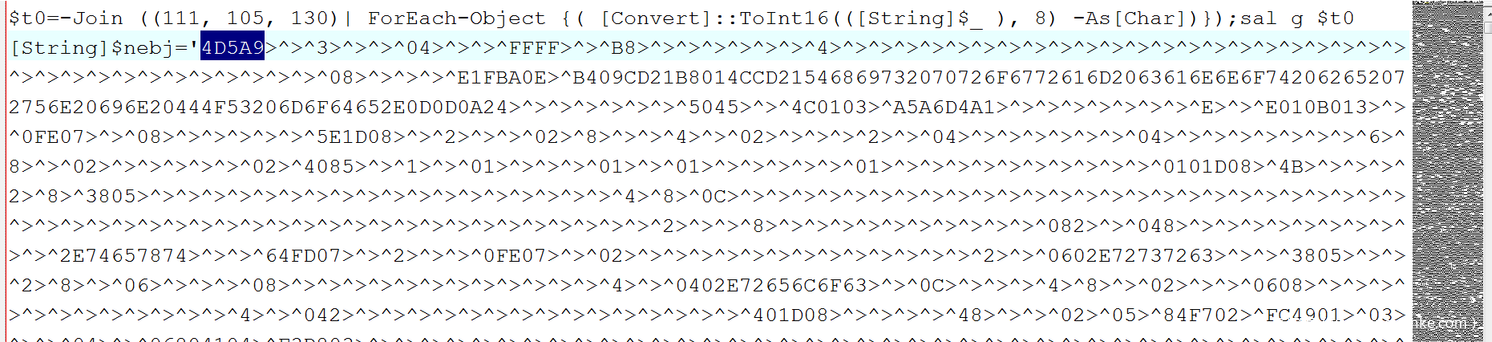 然后程序声明了一个超级长的String,根据开头的[String]$nebj=’4D5A9>^>^3>^可以知道这里其实是一个PE文件,后面肯定会有操作把这里的 特殊符号替换为00