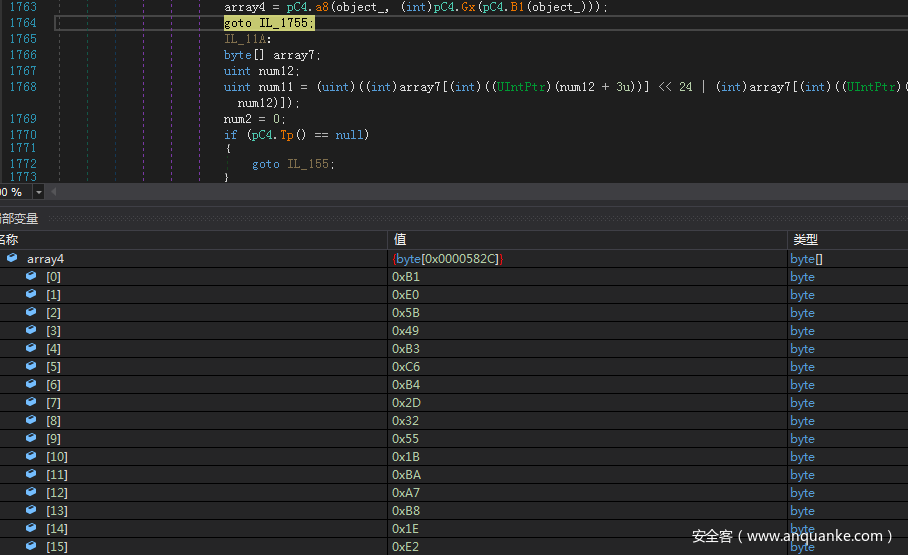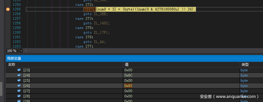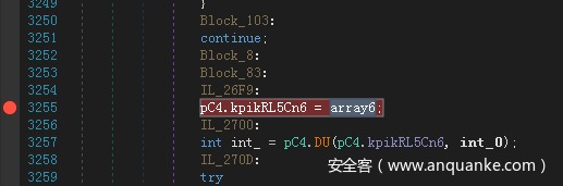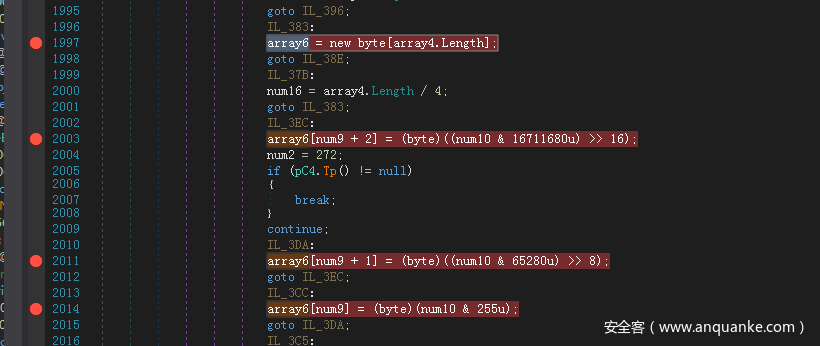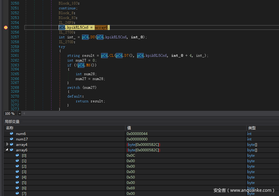 这里发现程序将array4的长度new了一个新的byte为array6,所以同样的,对array6所以操作点设置断点: