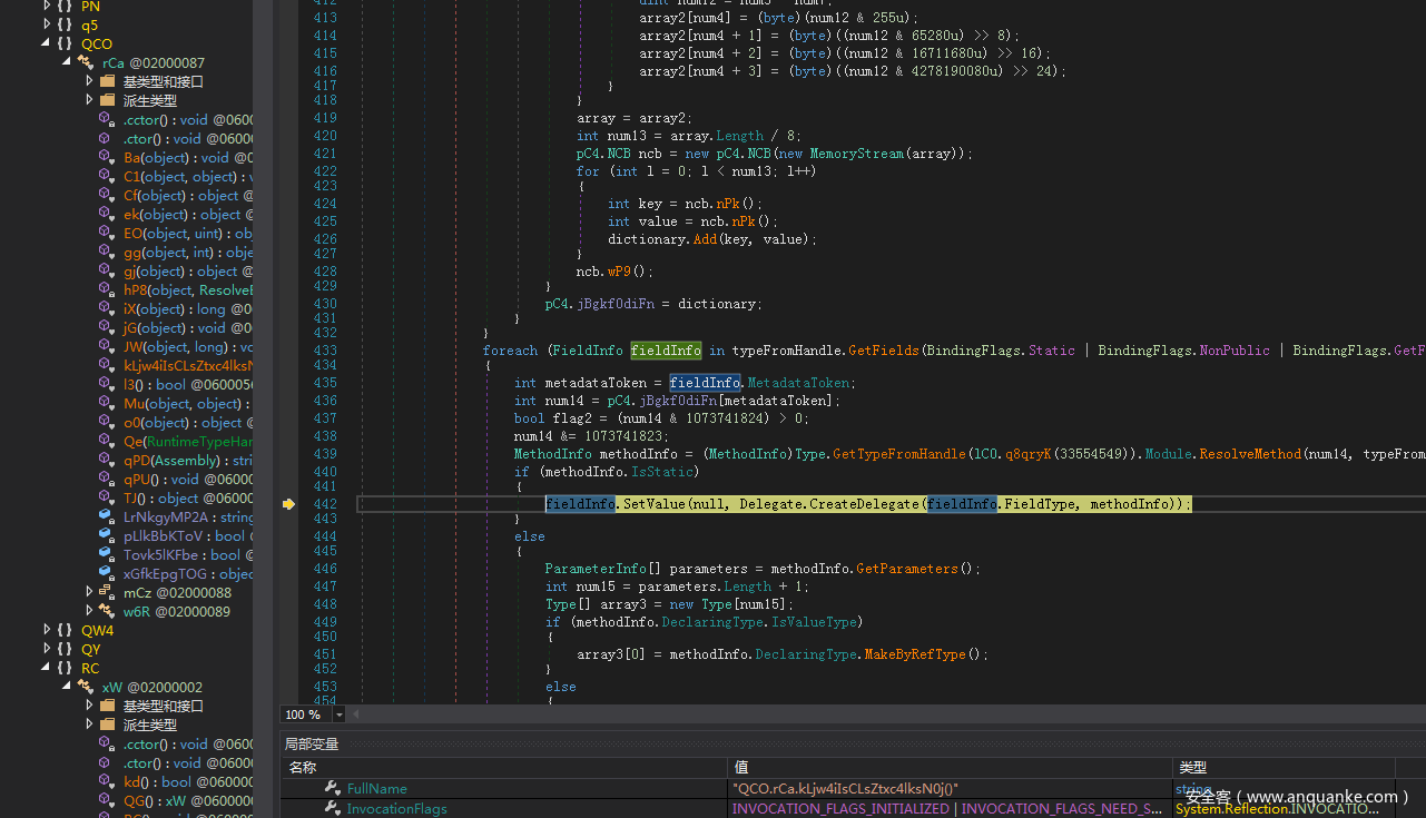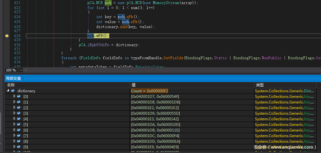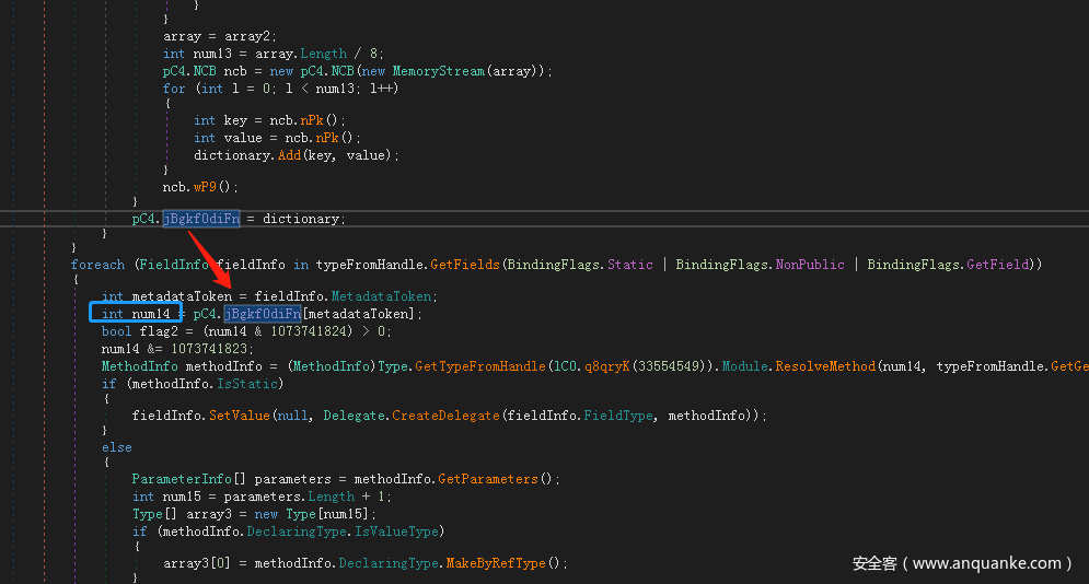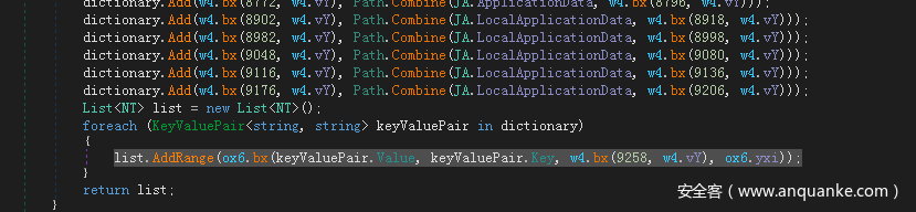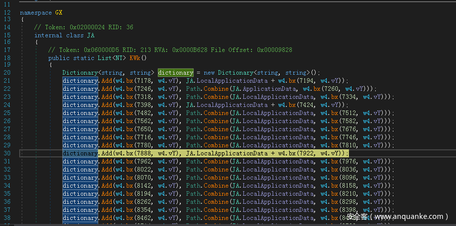 最后,程序将数据以键值对的方式存放到Dictionary中然后赋值给Jbgkf0diFn,再下面通过放射加载调用。