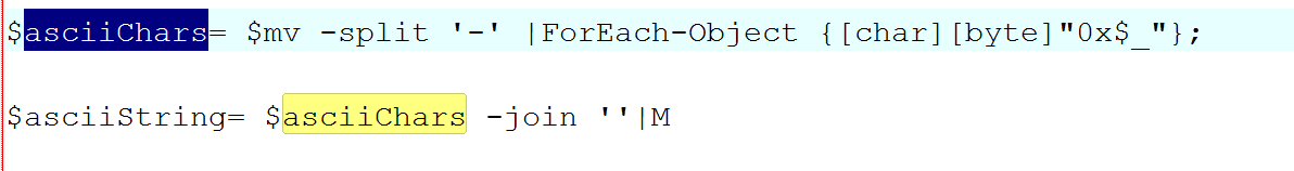 $asciiChars= $mv -split '-' |ForEach-Object {[char][byte]"0x$_"};
