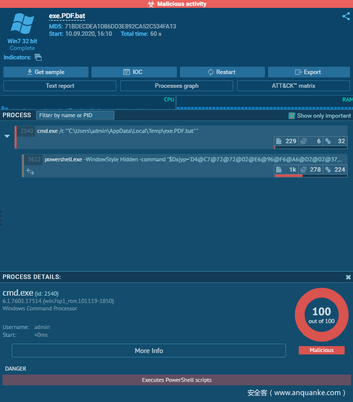 可以看到any.run已经将其标记为恶意并且可以从 any.run的沙箱中看到恶意行为是执行了一段powershell指令。