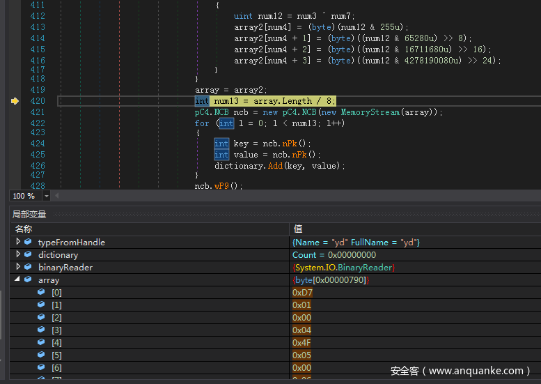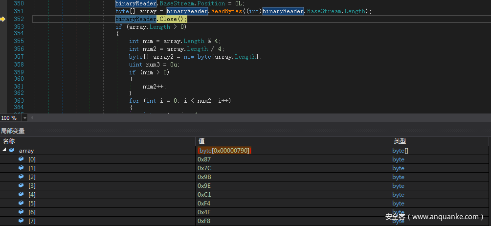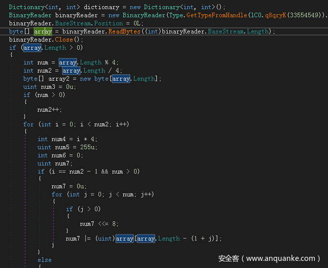 然后把资源赋值给了array数组,并在下面循环取解密这个资源数据