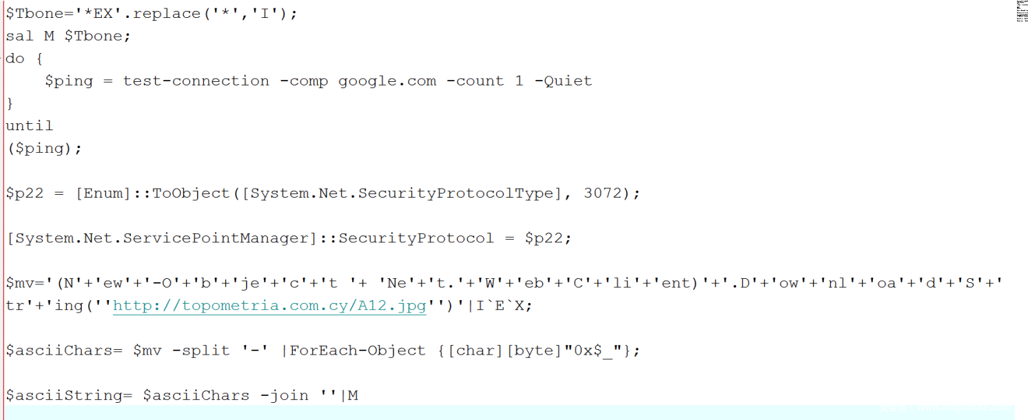 当确保网络畅通之后,代码在后面拼接一个对象,用于通过IEX执行一个下载指令,将下载回来的内容存储到变量$mv中,这里的下载链接为: http://topometria.com.cy/A12[.]jpg