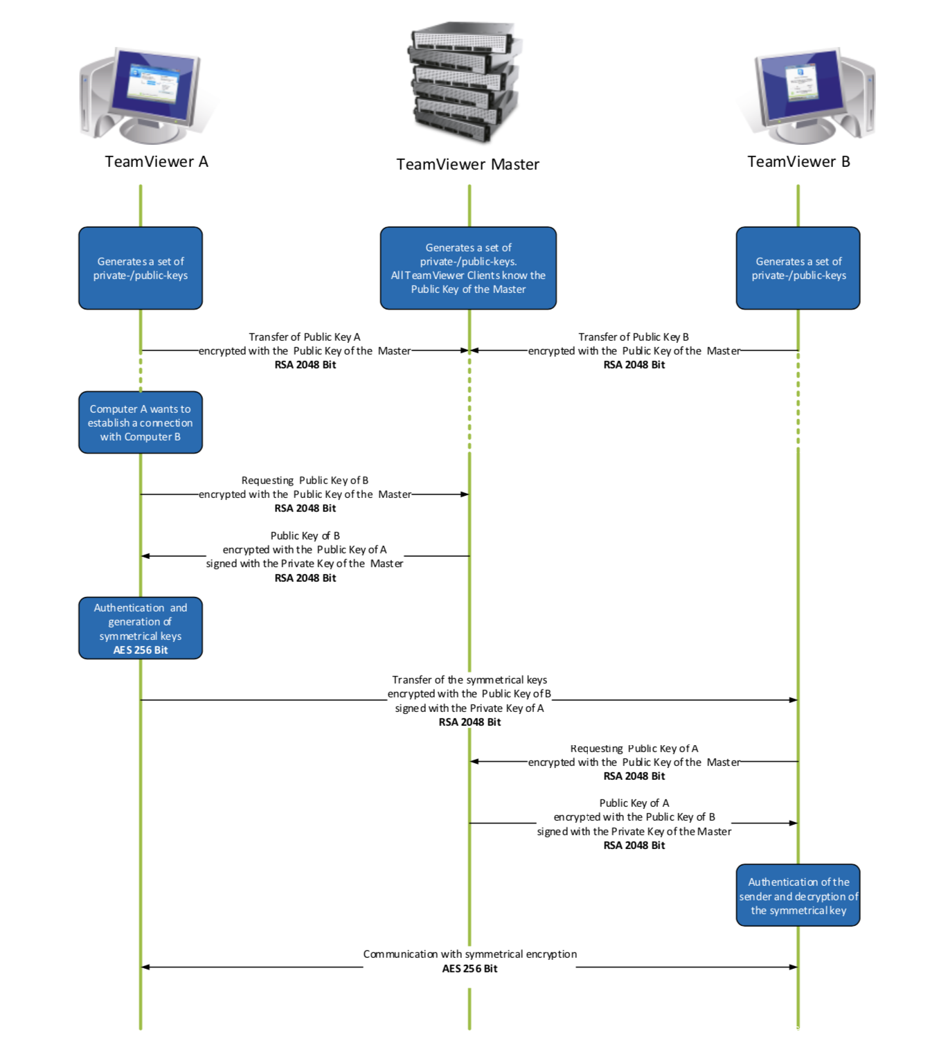 TeamViewer流量使用RSA公钥/私钥交换和AES(256位)会话进行加密保护。这项技术在https/SSL中有着可比性,在当今的安全标准中被认为是最安全的。由于私钥永远不会离开客户端计算机,所以整个过程可以确保互连的PC(包括TeamViewer路由服务器)都无法解密流量。