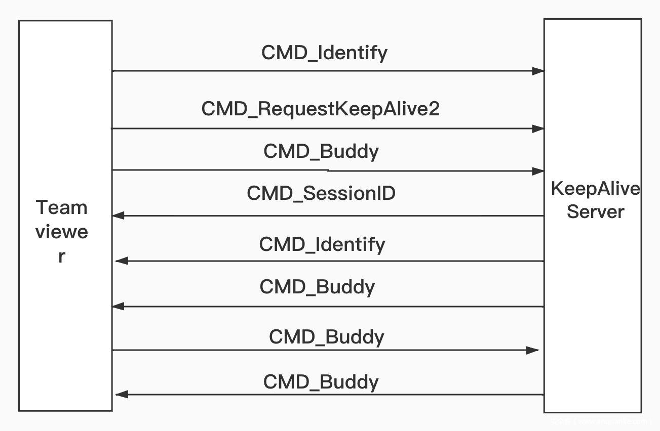 从图中,我们可以知道TeamViewer通过发送Buddy命令至KeepAliveServer。通过Buddy来确认KeepAliveServer存活状态、网络是否可达。Buddy命令其实与许可证相关,比如,某个客户违反免费许可证条例时,客户将被列入黑名单,即显示的是连接未就绪,它会要求用户使用商业模式。