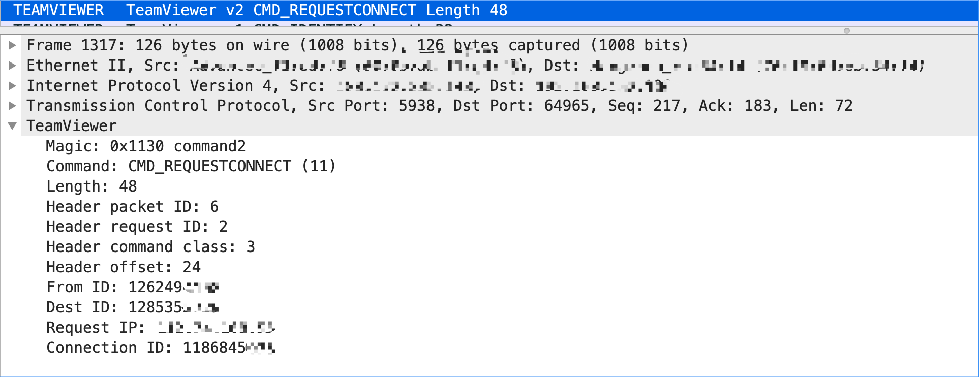 该命令包含向对方设备发送请求连接的信息。在此数据包的内容中,我们看到了另一台设备的实际TeamViewer ID,一个连接ID(可在通信的其他部分中用作参考),有时还包括发出请求的IP地址。