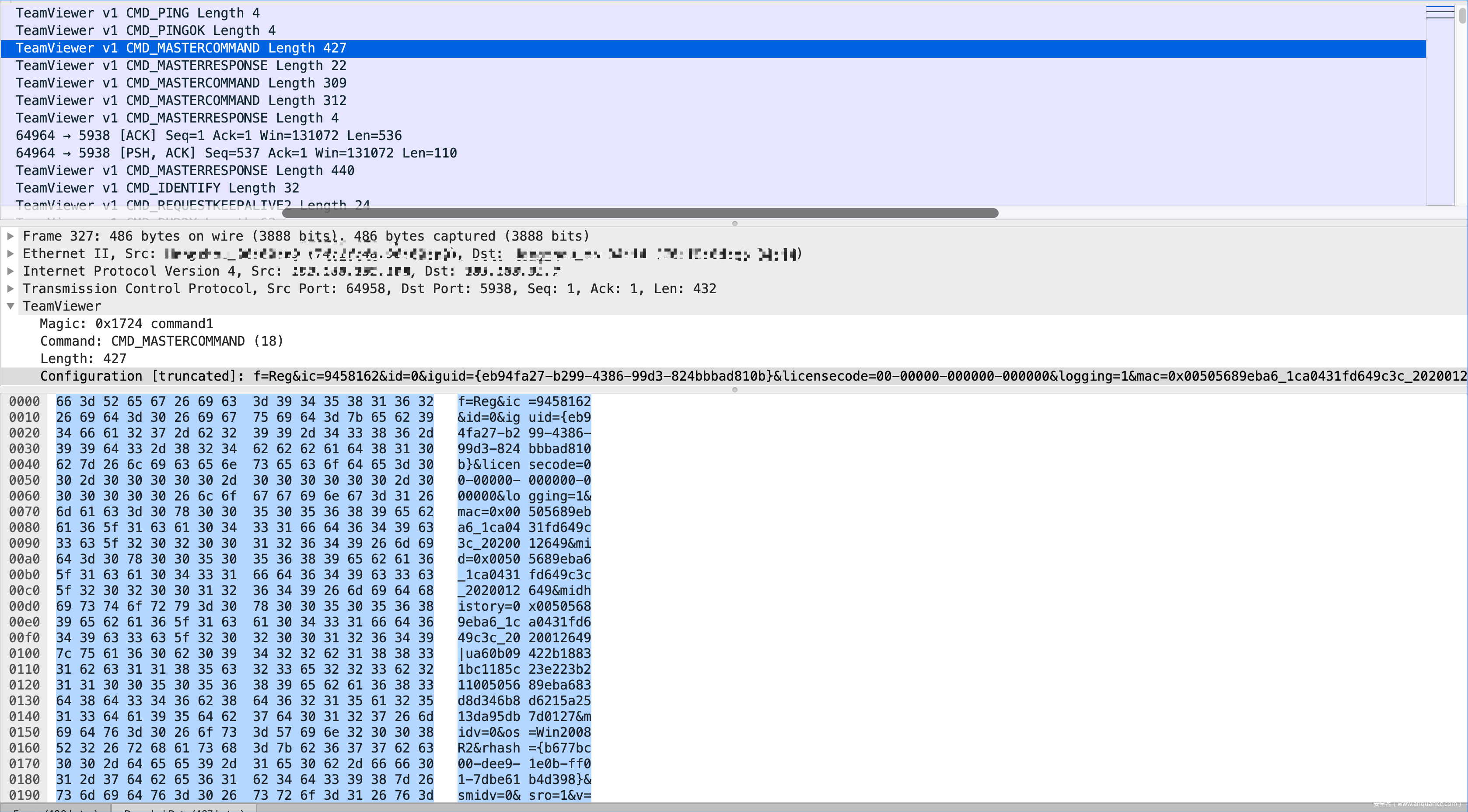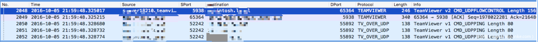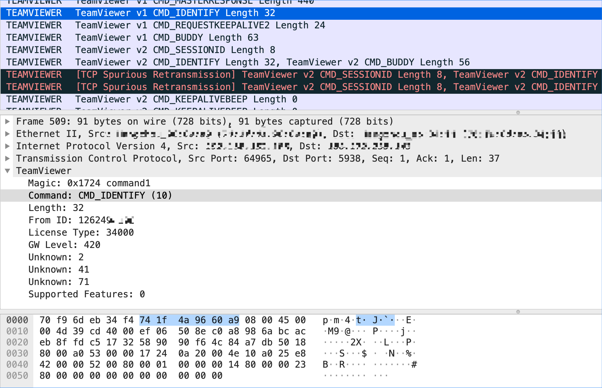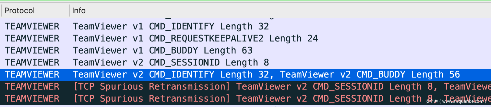 但是,读者们可能已经注意到UDP数据包(上面的蓝色)没有为其协议标记为TEAMVIEWER。原因是因为TeamViewer创建的UDP消息在内容的开头插入了其他空字节,从而更改了标头。