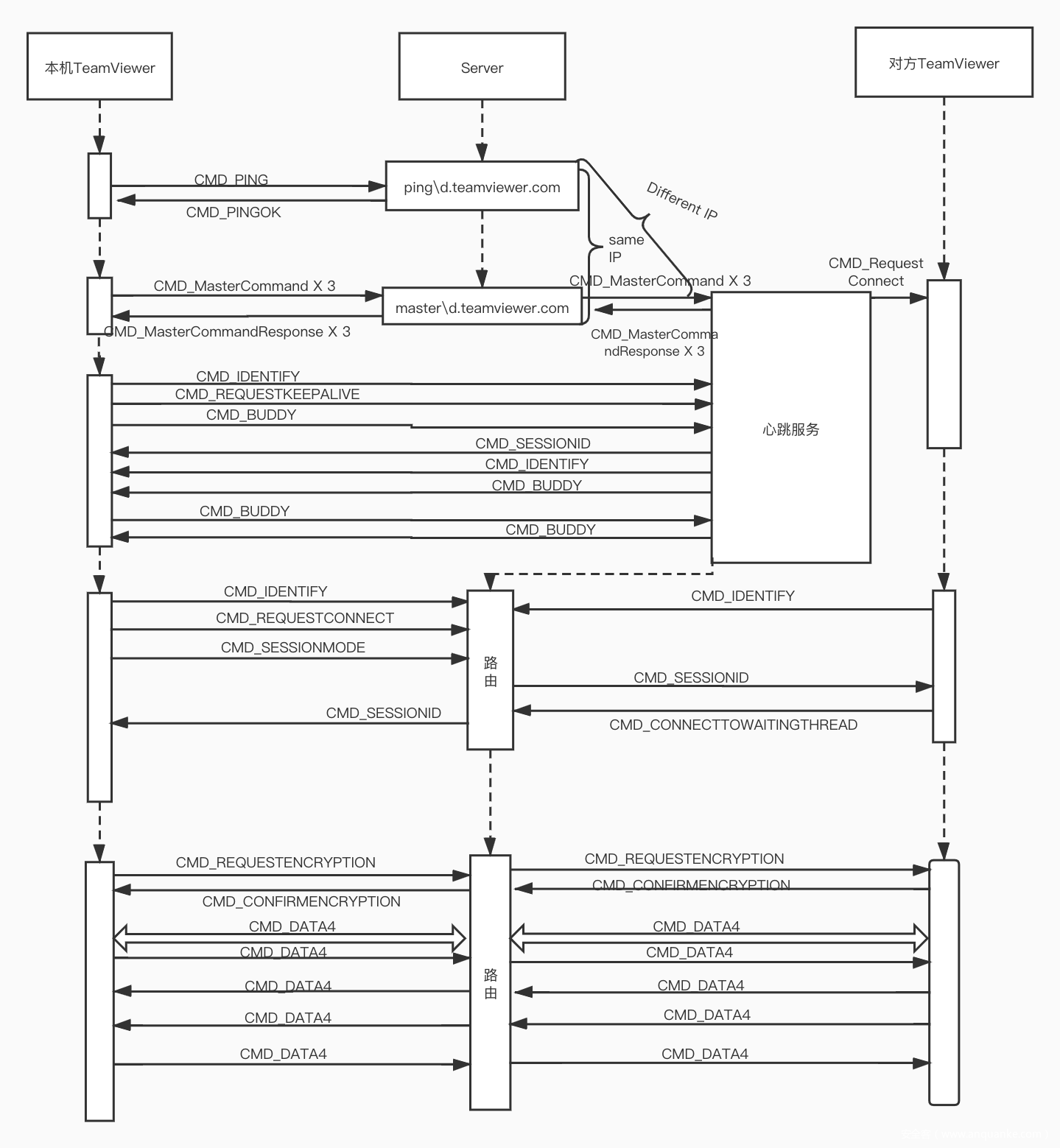 心跳包(keepalive server)用于维持在线状态。本机TeamViewer连接对方TeamViewer时候会发出心跳用于与对方TeamViewer进行通信、协商连接。本机TeamViewer登陆时候TeamViewer采用CMD_MasterCommand 命令,通过master服务器传出连接信息。