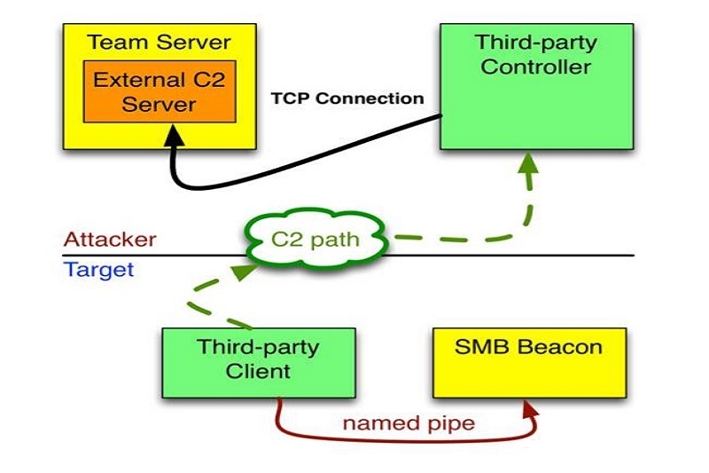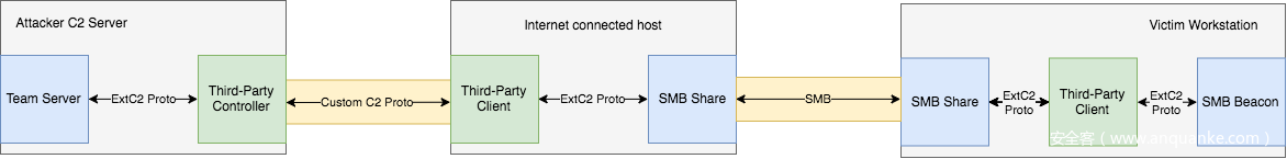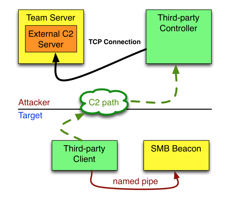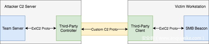 2、第三方客户端(Client):使用自定义C2通道与第三方Controller通信,将命令转发至SMB Beacon。